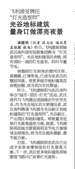 昨日,飛利浦照明被武漢高科國有控股集團(tuán)聘為“燈光造型師”。光谷地標(biāo)建筑的夜晚,將有國際一流的燈光造型,同時盡量節(jié)電。
