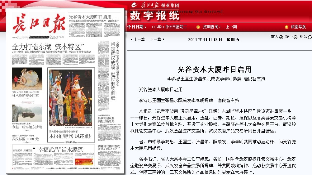 昨日啟用的光谷資本大廈一期已有36家單位入駐,主要涉及金融、證券、期貨、擔(dān)保以及各類要素交易機(jī)構(gòu)等十大類別,開(kāi)設(shè)了企業(yè)股權(quán)、金融資產(chǎn)、環(huán)境資源等七大金融要素交易平臺(tái)。首批入駐單位開(kāi)展業(yè)務(wù)后,光谷資本大廈將進(jìn)行二期開(kāi)發(fā)和建設(shè),增加辦公中心、交易中心、路演中心、會(huì)議中心和商務(wù)中心等多種服務(wù),發(fā)揮大廈的交易、展示、窗口、辦公、會(huì)務(wù)、綜合服務(wù)等六項(xiàng)功能。