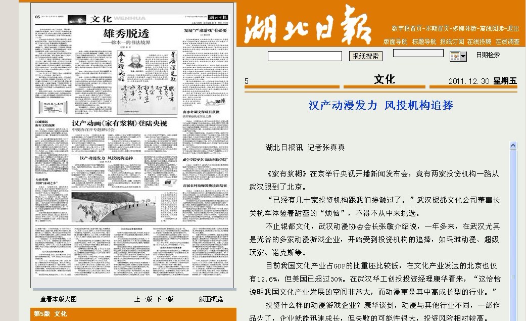 不止銀都文化,武漢動(dòng)漫協(xié)會(huì)會(huì)長(zhǎng)張敏介紹說,一年多來,在武漢尤其是光谷的多家動(dòng)漫游戲企業(yè),開始受到投資機(jī)構(gòu)的追捧,如瑪雅動(dòng)漫、超級(jí)玩家、諾克斯等。