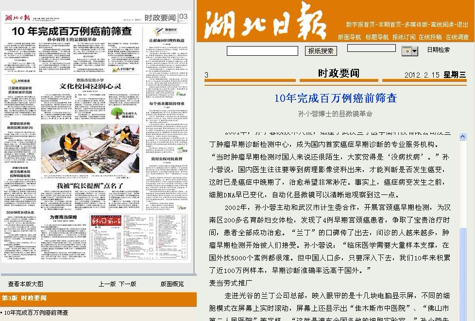 2002年,孫小蓉主動(dòng)和武漢市計(jì)生委合作,開展宮頸癌早期檢測(cè),為漢南區(qū)200多名育齡婦女體檢,發(fā)現(xiàn)了4例早期宮頸癌患者,爭取了寶貴治療時(shí)間,患者全部成功治愈?!疤m丁”的口碑傳了出去,問診的人越來越多,腫瘤早期檢測(cè)開始被人們接受。孫小蓉說:“臨床醫(yī)學(xué)需要大量樣本支撐,在國外找5000個(gè)案例都很難。但中國人口多,只要深入下去,我們10年來積累了近100萬例樣本,早期診斷準(zhǔn)確率遠(yuǎn)高于國外。”