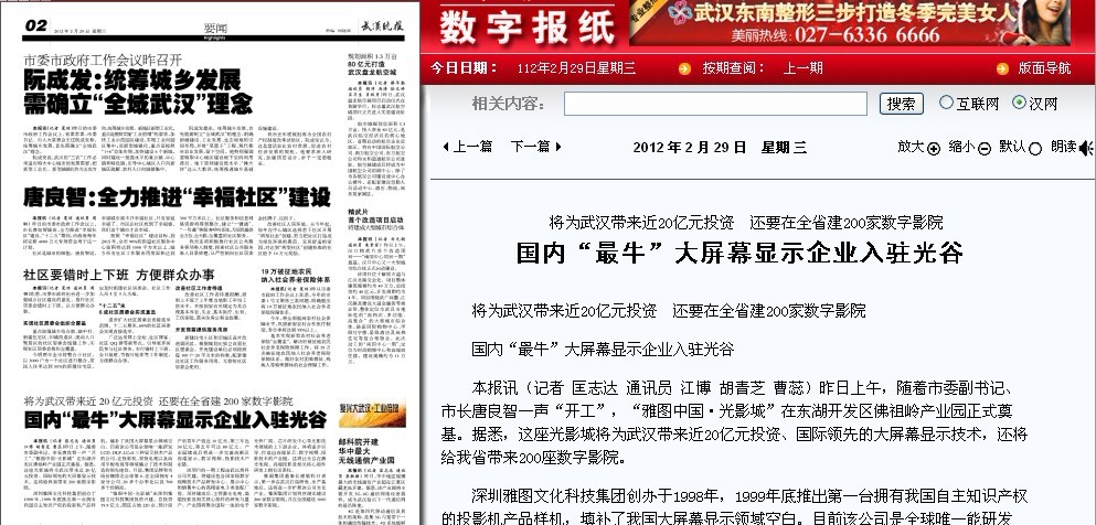 雅圖集團(tuán)董事長(zhǎng)謝敬昨日表示,第一步在武漢打造研發(fā)、生產(chǎn)基地后,還將進(jìn)一步擴(kuò)展該公司文化產(chǎn)業(yè)。雅圖集團(tuán)計(jì)劃將在湖北建設(shè)200家數(shù)字影院,并在全國(guó)建設(shè)1000家數(shù)字影院。
