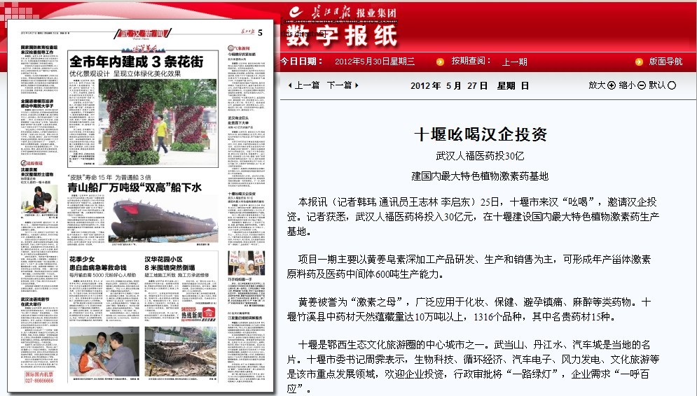 本報訊(記者韓瑋?通訊員王志林?李啟東)25日,十堰市來漢“吆喝”,邀請漢企投資。記者獲悉,武漢人福醫(yī)藥將投入30億元,在十堰建設國內最大特色植物激素藥生產基地。