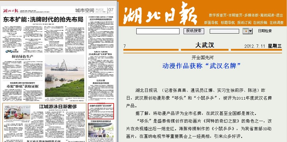 湖北日?qǐng)?bào)訊?(記者張真真、通訊員江博、實(shí)習(xí)生徐莉莎、陳潔)昨日,武漢原創(chuàng)動(dòng)漫形象“哆樂”和“小鼠乒乒”,被評(píng)為2011年度武漢名牌產(chǎn)品。