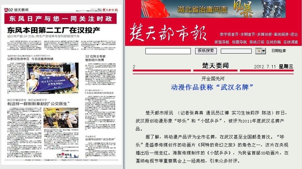 楚天金報:光谷動漫作品獲“武漢名牌”