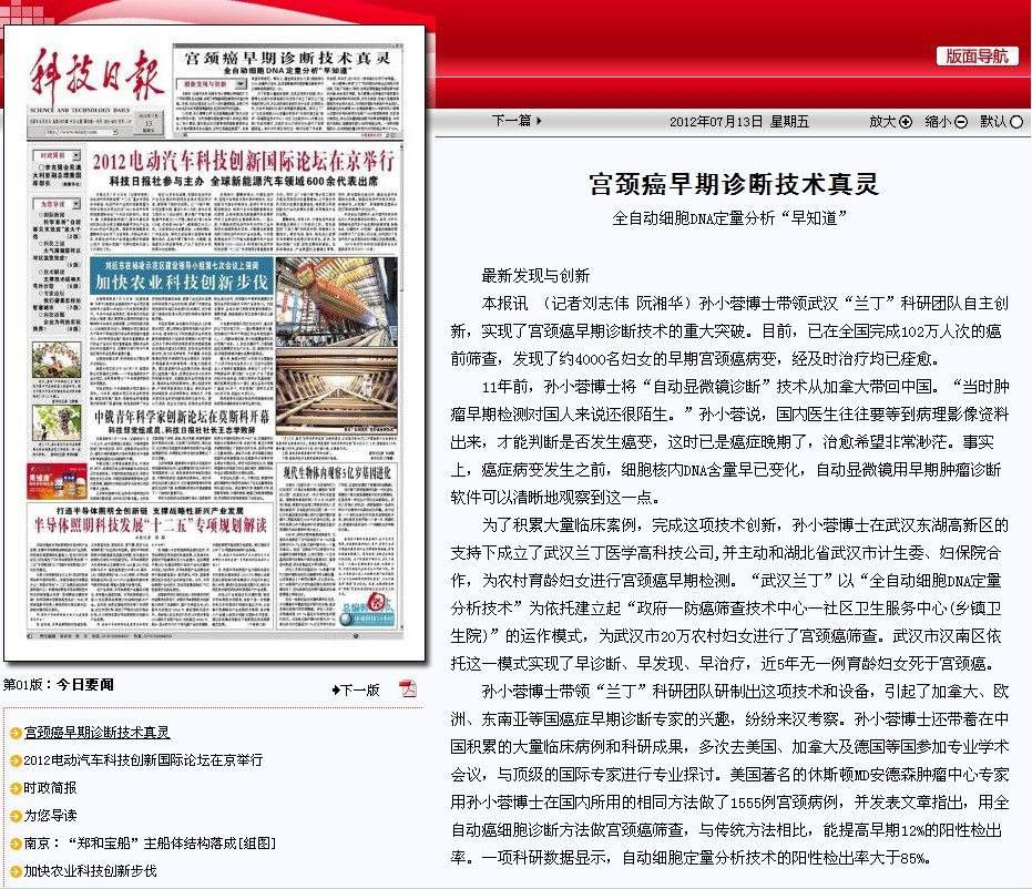為了積累大量臨床案例,完成這項技術(shù)創(chuàng)新,孫小蓉博士在武漢東湖高新區(qū)的支持下成立了武漢蘭丁醫(yī)學(xué)高科技公司,并主動和湖北省武漢市計生委、婦保院合作,為農(nóng)村育齡婦女進(jìn)行宮頸癌早期檢測?!拔錆h蘭丁”以“全自動細(xì)胞DNA定量分析技術(shù)”為依托建立起“政府—防癌篩查技術(shù)中心—社區(qū)衛(wèi)生服務(wù)中心(鄉(xiāng)鎮(zhèn)衛(wèi)生院)”的運作模式,為武漢市20萬農(nóng)村婦女進(jìn)行了宮頸癌篩查。武漢市漢南區(qū)依托這一模式實現(xiàn)了早診斷、早發(fā)現(xiàn)、早治療,近5年無一例育齡婦女死于宮頸癌。