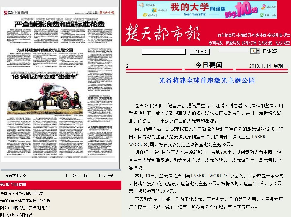 ????再過兩年左右,武漢市民在家門口就能體驗(yàn)到豐富得多的激光游樂設(shè)施。昨日,國內(nèi)激光業(yè)巨頭楚天激光集團(tuán)宣布聯(lián)手歐洲著名激光企業(yè)?LASER WORLD公司,將在光谷打造全球首座激光主題公園。