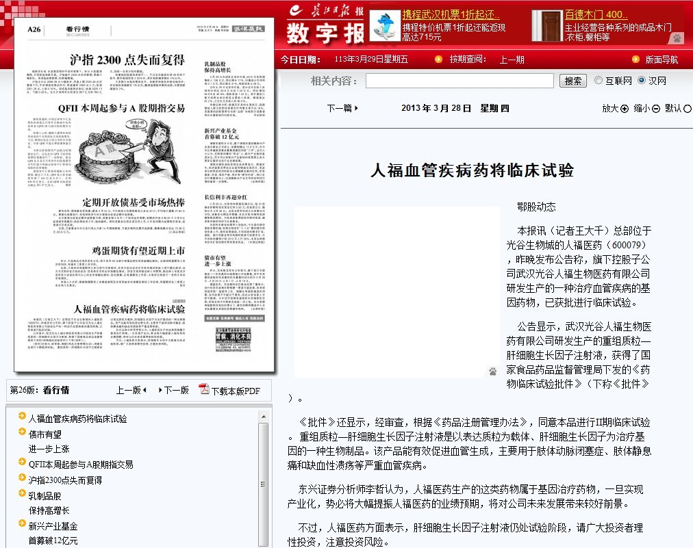 ????公告顯示,武漢光谷人福生物醫(yī)藥有限公司研發(fā)生產(chǎn)的重組質(zhì)粒—肝細(xì)胞生長(zhǎng)因子注射液,獲得了國家食品藥品監(jiān)督管理局下發(fā)的《藥物臨床試驗(yàn)批件》(下稱《批件》)。