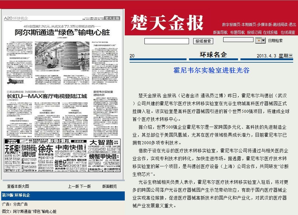 ????借助于設(shè)在光谷的醫(yī)療技術(shù)轉(zhuǎn)移實(shí)驗(yàn)室,霍尼韋爾公司將通過與相關(guān)醫(yī)藥企業(yè)合作,實(shí)現(xiàn)專利技術(shù)的轉(zhuǎn)化,加快走進(jìn)市場。據(jù)透露,霍尼韋爾醫(yī)療技術(shù)轉(zhuǎn)移實(shí)驗(yàn)室的第一個(gè)項(xiàng)目,是與德創(chuàng)醫(yī)療設(shè)備(上海)公司合作,共同研發(fā)“診斷生物芯片”。