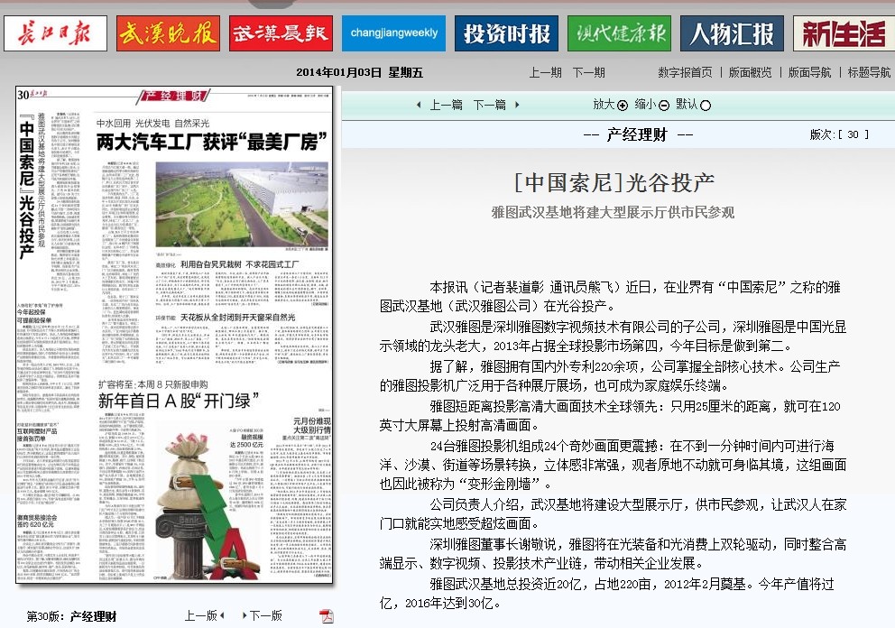 武漢雅圖是深圳雅圖數(shù)字視頻技術(shù)有限公司的子公司,深圳雅圖是中國光顯示領(lǐng)域的龍頭老大,2013年占據(jù)全球投影市場第四,今年目標(biāo)是做到第二。