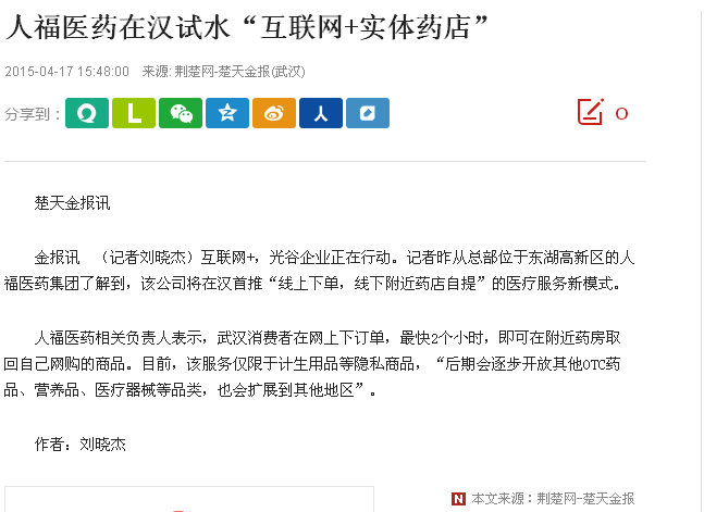 金報訊 (記者劉曉杰)互聯(lián)網(wǎng)+,光谷企業(yè)正在行動。記者昨從總部位于東湖高新區(qū)的人福醫(yī)藥集團了解到,該公司將在漢首推“線上下單,線下附近藥店自提”的醫(yī)療服務新模式。