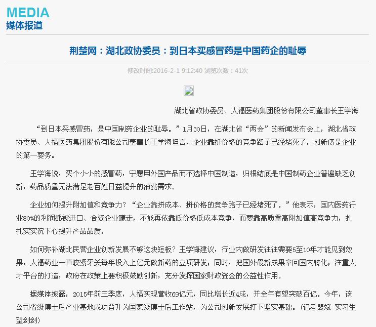 ? ? ? ? “到日本買感冒藥,是中國制藥企業(yè)的恥辱。”1月30日,在湖北省“兩會”的新聞發(fā)布會上,湖北省政協(xié)委員、人福醫(yī)藥集團(tuán)股份有限公司董事長王學(xué)海坦言,企業(yè)靠拼價格的競爭路子已經(jīng)堵死了,創(chuàng)新仍是企業(yè)的第一要務(wù)。