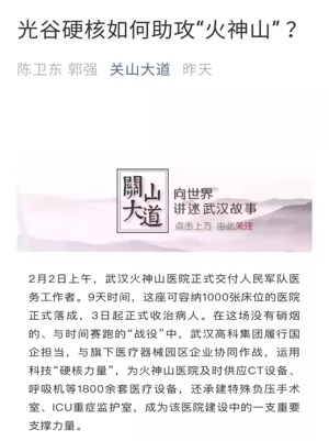 (作者:陳衛(wèi)東 郭強)2月2日上午,武漢火神山醫(yī)院正式交付人民軍隊醫(yī)務(wù)工作者。9天時間,這座可容納1000張床位的醫(yī)院正式落成,3日起正式收治病人。在這場沒有硝煙的、與時間賽跑的“戰(zhàn)役”中,武漢高科集團履行國企擔(dān)當(dāng),與旗下醫(yī)療器械園區(qū)企業(yè)協(xié)同作戰(zhàn),運用科技“硬核力量”,為火神山醫(yī)院及時供應(yīng)CT設(shè)備、呼吸機等1800余套醫(yī)療設(shè)備,還承建特殊負(fù)壓手術(shù)室、ICU重癥監(jiān)護室,成為該醫(yī)院建設(shè)中的一支重要支撐力量。