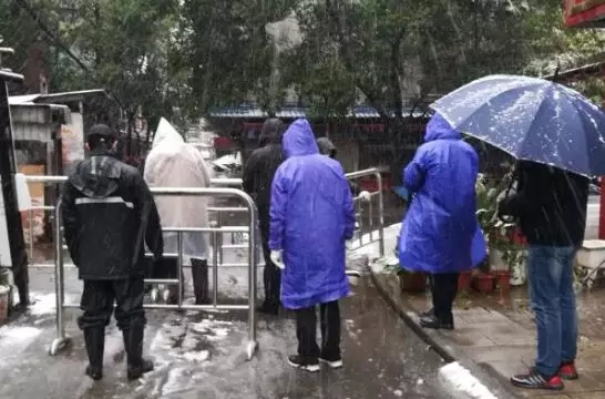 2月15日,氣溫驟降,風雪交加。洪山區(qū)和平街武豐社區(qū)武豐佳園南門入口處,武漢市氣象局機關黨委副書記楊峻和業(yè)務科技處黨支部書記黃華麗一起站崗,顧不得冰冷的腳和凍得不靈活的雙手。這是他們下沉社區(qū)一同作戰(zhàn)的第12天?!安还茱L雨有多大,我們會堅守。”