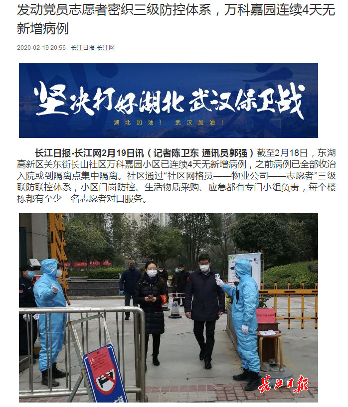 長(zhǎng)江日?qǐng)?bào)-長(zhǎng)江網(wǎng)2月19日訊(記者陳衛(wèi)東?通訊員郭強(qiáng))截至2月18日,東湖高新區(qū)關(guān)東街長(zhǎng)山社區(qū)萬(wàn)科嘉園小區(qū)已連續(xù)4天無(wú)新增病例,之前病例已全部收治入院或到隔離點(diǎn)集中隔離。社區(qū)通過(guò)“社區(qū)網(wǎng)格員——物業(yè)公司——志愿者”三級(jí)聯(lián)防聯(lián)控體系,小區(qū)門崗防控、生活物質(zhì)采購(gòu)、應(yīng)急都有專門小組負(fù)責(zé),每個(gè)樓棟都有至少一名志愿者對(duì)口服務(wù)。