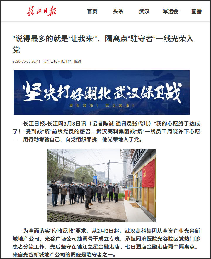 長(zhǎng)江日?qǐng)?bào)-長(zhǎng)江網(wǎng)3月8日訊(記者陳誠(chéng) 通訊員張代瑋)“我的心愿終于達(dá)成了!”受到戰(zhàn)“疫”前線黨員的感召,武漢高科集團(tuán)戰(zhàn)“疫”一線員工周曉許下心愿——用行動(dòng)考驗(yàn)自己,向黨組織靠攏,他光榮地入了黨。