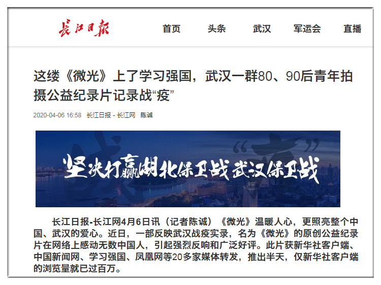 長江日報-長江網(wǎng)4月6日訊(記者陳誠)《微光》溫暖人心,更照亮整個中國、武漢的愛心。近日,一部反映武漢戰(zhàn)疫實錄,名為《微光》的原創(chuàng)公益紀錄片在網(wǎng)絡上感動無數(shù)中國人,引起強烈反響和廣泛好評。此片獲新華社客戶端、中國新聞網(wǎng)、學習強國、鳳凰網(wǎng)等20多家媒體轉(zhuǎn)發(fā),推出半天,僅新華社客戶端的瀏覽量就已過百萬。