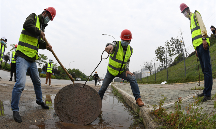 4月22日,施工人員對(duì)武漢光谷華星光電外部道路排水管網(wǎng)進(jìn)行疏通。面對(duì)即將來(lái)臨的汛期,武漢高科組建防汛抗旱應(yīng)急組,對(duì)武漢光谷重要企業(yè)所在的18條市政道路排水管網(wǎng),以及還建社區(qū)近2700個(gè)檢查井、220個(gè)雨水篦子進(jìn)行全面檢查維護(hù),確保平安度汛。(湖北日?qǐng)?bào)全媒記者 田悅 通訊員 張代瑋 攝)