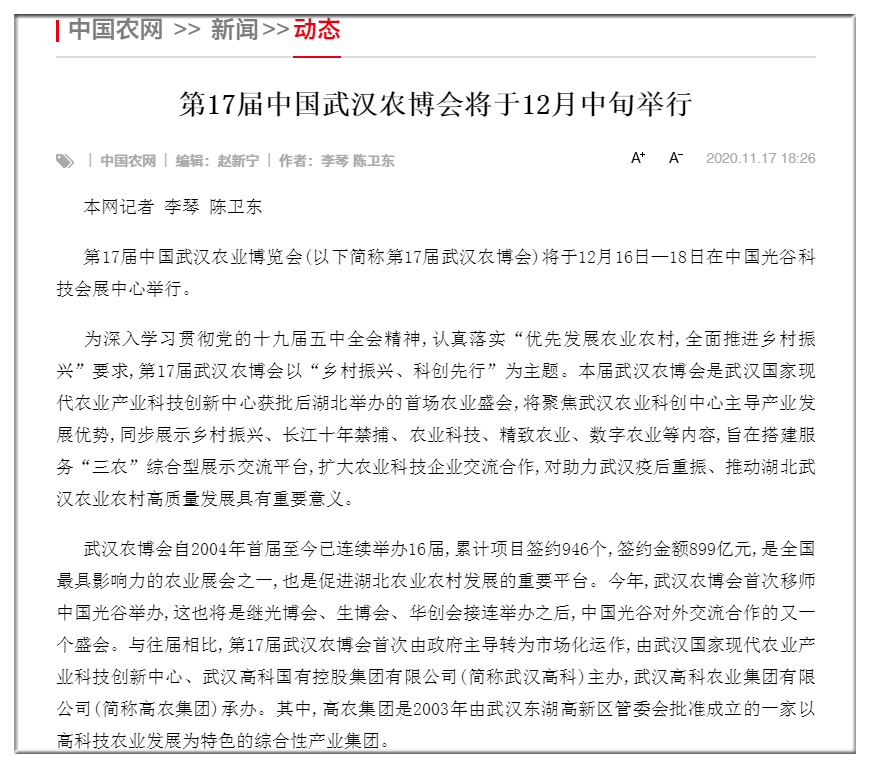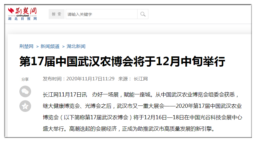 武漢市人民政府官網(wǎng):第17屆中國(guó)武漢農(nóng)博會(huì)12月中旬舉行?首次由政府主導(dǎo)轉(zhuǎn)為市場(chǎng)化運(yùn)作