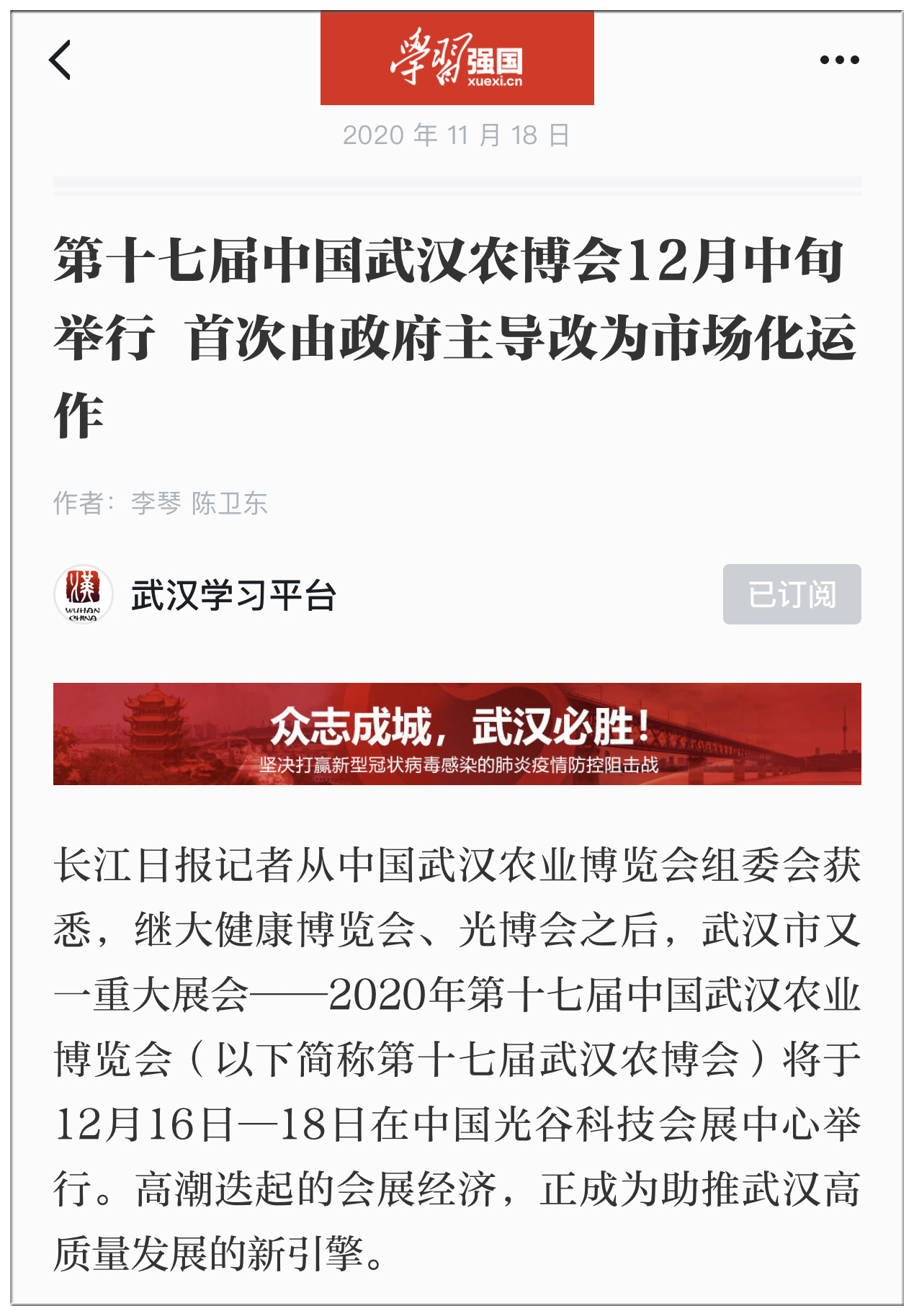 學(xué)習(xí)強(qiáng)國(guó):第十七屆中國(guó)武漢農(nóng)博會(huì)12月中旬舉行 首次由政府主導(dǎo)改為市場(chǎng)化運(yùn)作