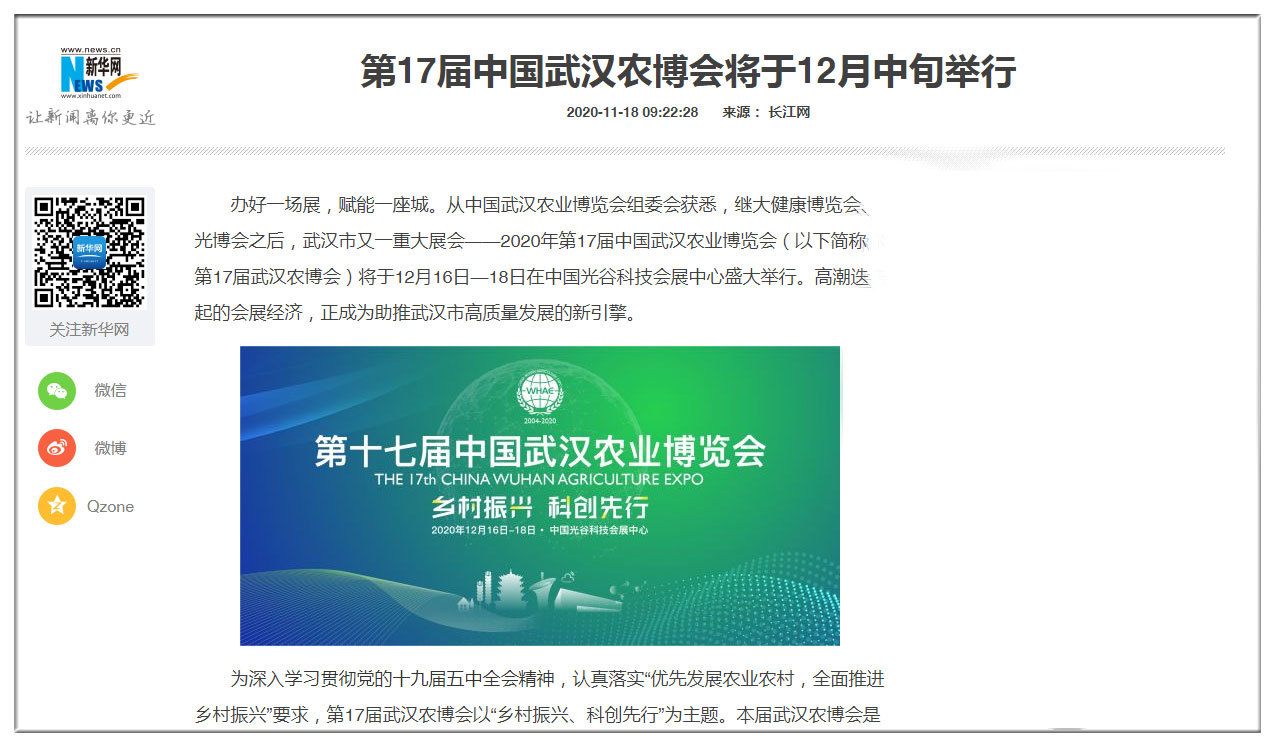 新華網(wǎng):第17屆中國(guó)武漢農(nóng)博會(huì)將于12月中旬舉行