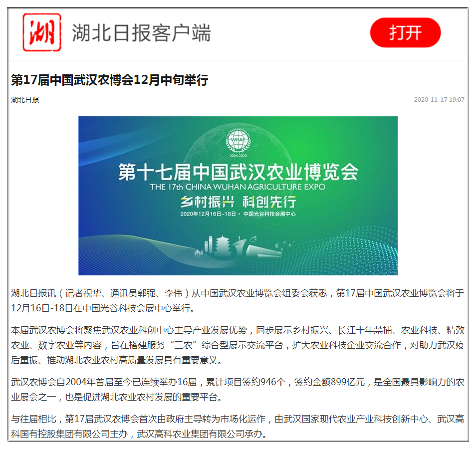 人民日?qǐng)?bào):第17屆中國(guó)武漢農(nóng)業(yè)博覽會(huì)12月16日開幕