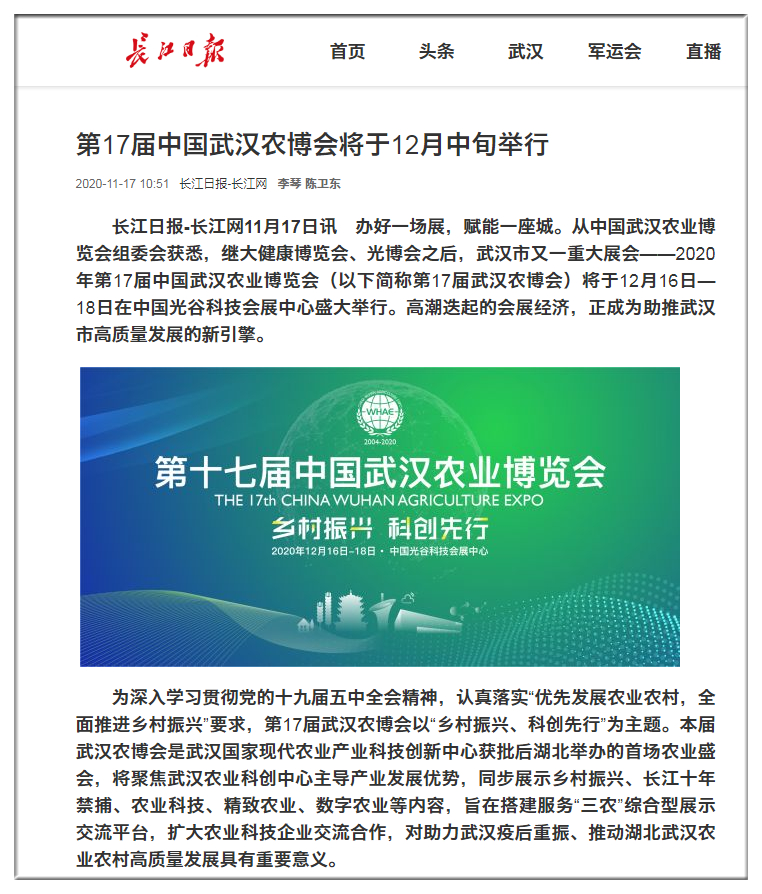 長(zhǎng)江日?qǐng)?bào)-長(zhǎng)江網(wǎng):第17屆中國(guó)武漢農(nóng)博會(huì)將于12月中旬舉行