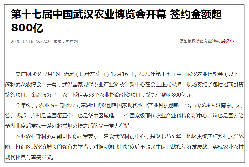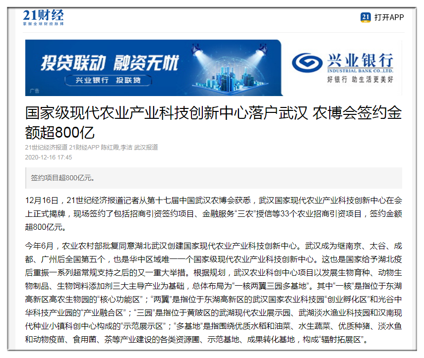 21世紀(jì)經(jīng)濟:國家級現(xiàn)代農(nóng)業(yè)產(chǎn)業(yè)科技創(chuàng)新中心落戶武漢