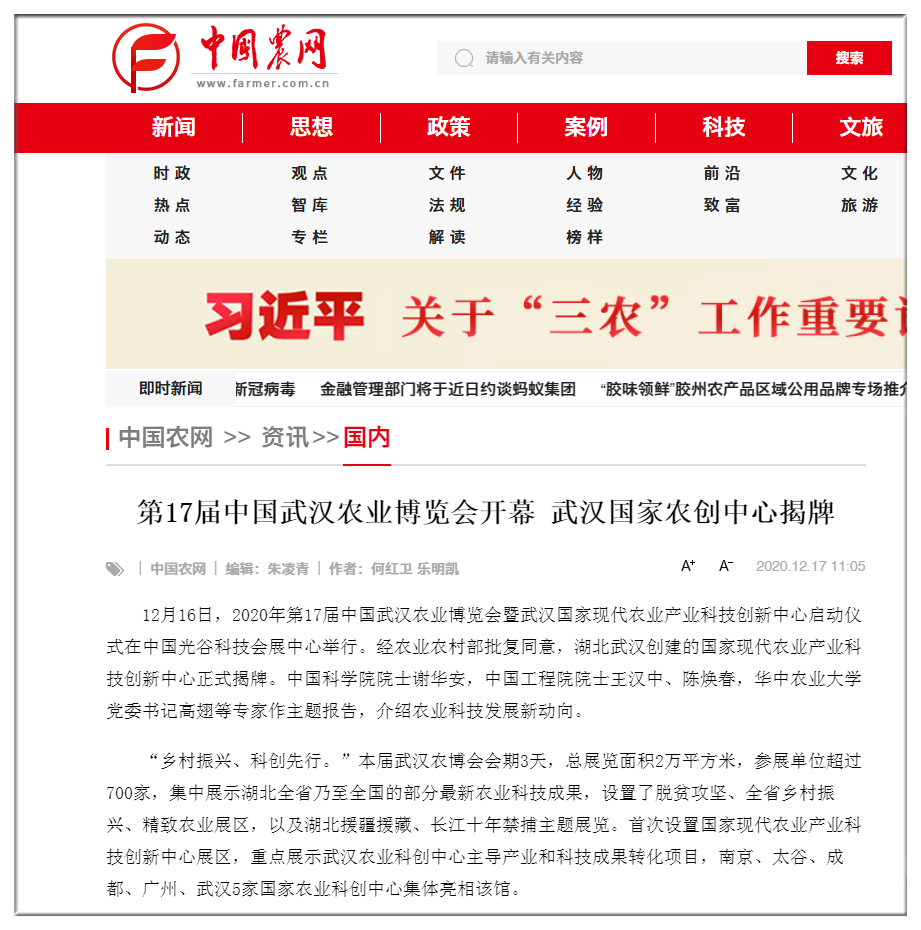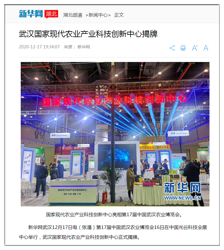 新華網(wǎng):武漢國(guó)家現(xiàn)代農(nóng)業(yè)產(chǎn)業(yè)科技創(chuàng)新中心揭牌