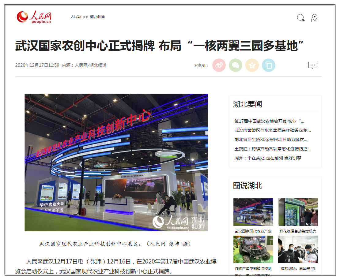 人民網(wǎng):武漢國(guó)家農(nóng)創(chuàng)中心正式揭牌 布局“一核兩翼三園多基地”
