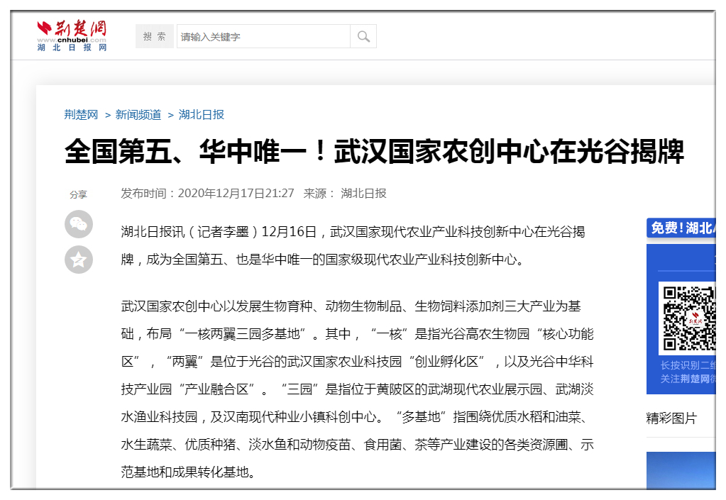 湖北日?qǐng)?bào):全國(guó)第五、華中唯一!武漢國(guó)家農(nóng)創(chuàng)中心在光谷揭牌