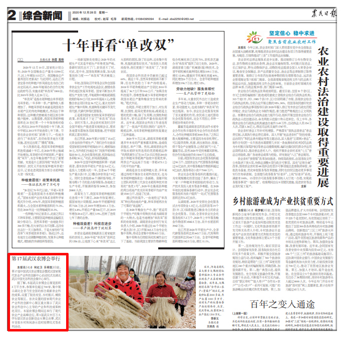 本報訊(記者何紅衛(wèi)?樂明凱)日前,第17屆中國武漢農(nóng)業(yè)博覽會暨武漢國家現(xiàn)代農(nóng)業(yè)產(chǎn)業(yè)科技創(chuàng)新中心啟動儀式在湖北武漢中國光谷科技會展中心舉行。