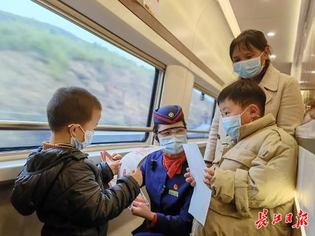 在武漢開往深圳北的G77次列車上,列車長朱盛嬌提前把講述雷鋒事跡和精神的畫報張貼在列車上,向旅客們講述;在武漢開往北京西的G516次列車上,列車長周杰組織列車員為車內旅客提供口罩;在武漢開往黃岡東的C5613次列車上,乘務員謝康平通過圖片向大家介紹雷鋒事跡,并與旅客交流感受。(長江日報-長江網(wǎng)記者王謙 通訊員劉娟 黃潔攝影報道)