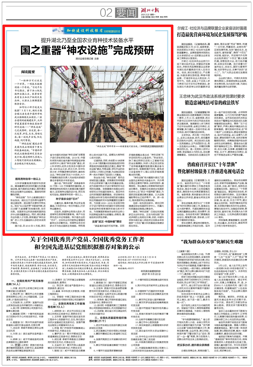 “神農(nóng)設施”將大幅提升湖北乃至全國農(nóng)業(yè)育種技術裝備水平,充分滿足周邊主要用戶群體,如研究院所、高等院校、種業(yè)集團公司等育種研發(fā)的迫切需求,支撐武漢東湖綜合性國家科學中心及“武漢·中國種都”建設,為國家實驗室建設奠定基礎,以大設施輻射帶動長江經(jīng)濟帶產(chǎn)、學、研一體化,服務國家種業(yè)發(fā)展戰(zhàn)略。