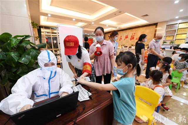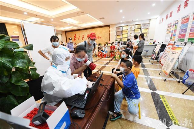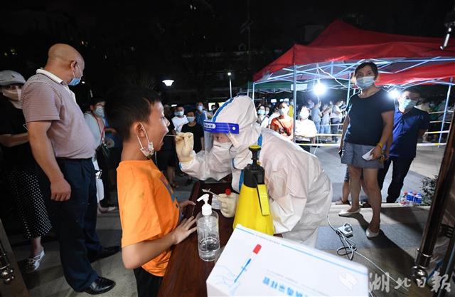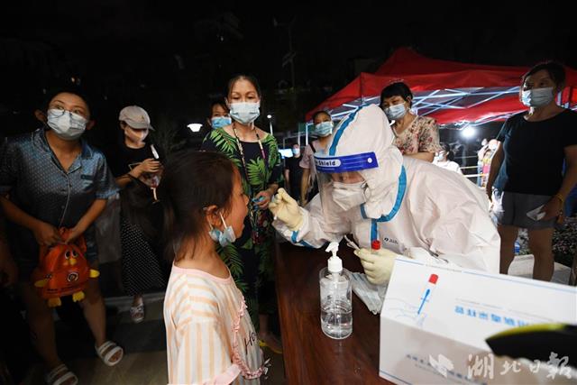 8月4日晚,武漢東湖高新區(qū)關(guān)東街長(zhǎng)山社區(qū)為轄區(qū)兒童開辦核酸檢測(cè)專場(chǎng),在武漢高科集團(tuán)下沉社區(qū)志愿者協(xié)助下,檢測(cè)點(diǎn)管理協(xié)調(diào)、信息錄入、入口指引等工作有條不紊進(jìn)行,確保每一位兒童安全順利完成核酸檢測(cè)。(湖北日?qǐng)?bào)全媒記者田悅 通訊員郭強(qiáng) 攝)