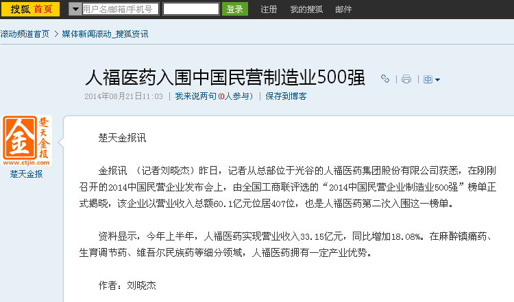 金報(bào)訊 (記者劉曉杰)昨日,記者從總部位于光谷的人福醫(yī)藥集團(tuán)股份有限公司獲悉,在剛剛召開的2014中國(guó)民營(yíng)企業(yè)發(fā)布會(huì)上,由全國(guó)工商聯(lián)評(píng)選的“2014中國(guó)民營(yíng)企業(yè)制造業(yè)500強(qiáng)”榜單正式揭曉,該企業(yè)以營(yíng)業(yè)收入總額60.1億元位居407位,也是人福醫(yī)藥第二次入圍這一榜單。
