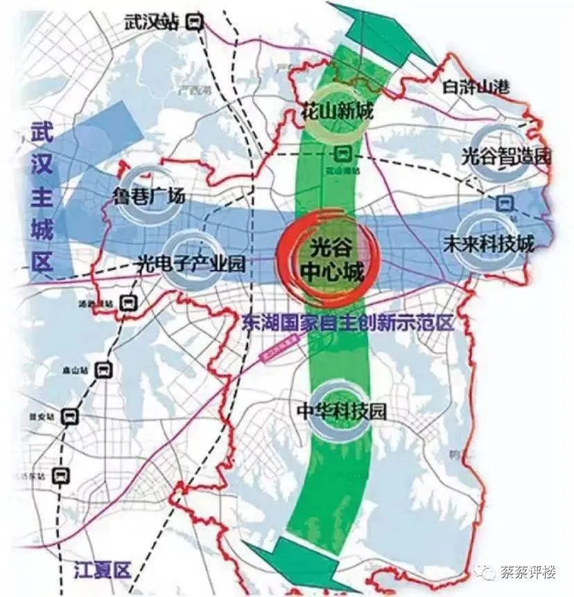 而區(qū)域之發(fā)展,在于常變常新。隨著老光谷布局趨于飽和,光谷發(fā)展進入東進時代。早在2019年2月東湖高新區(qū)召開工作會議中,便提出要高起點建立“東部副中心”,加快推進“一主兩副四組團”的城區(qū)空間布局,而“一主”是光谷中心城,“兩副”則為魯巷副中心和未來城副中心。
