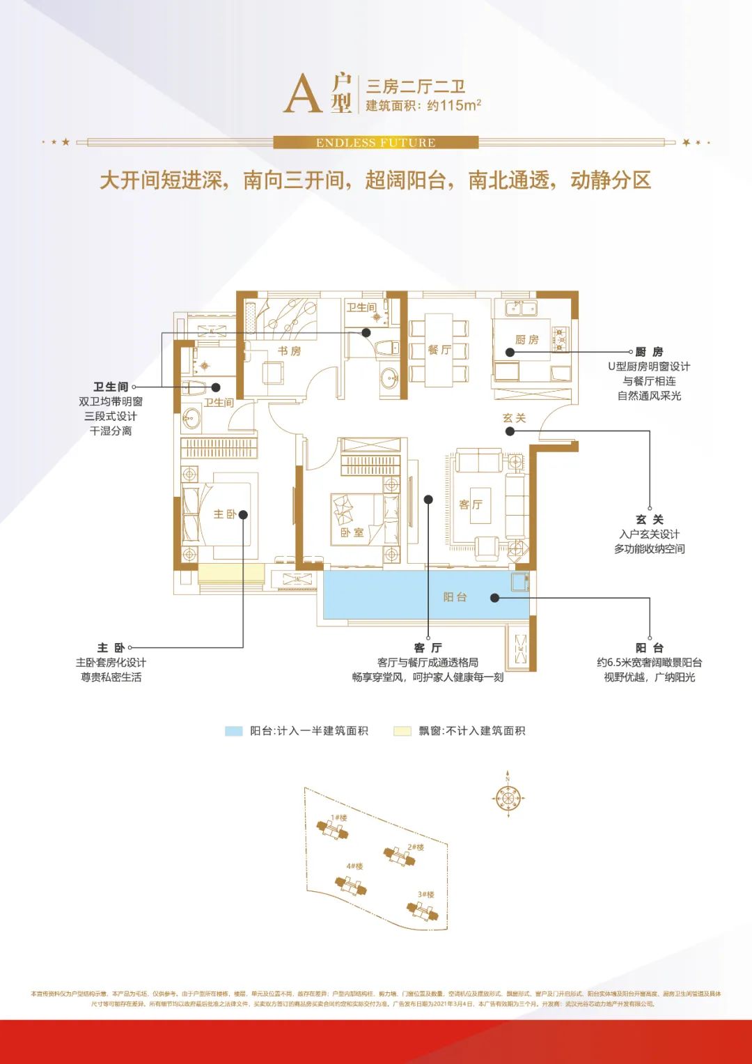 至于建面約115㎡的戶型,南向雙臥帶約6.5米陽臺,并且雙衛(wèi)設計,尺度比98㎡更大,居住舒適度更好。